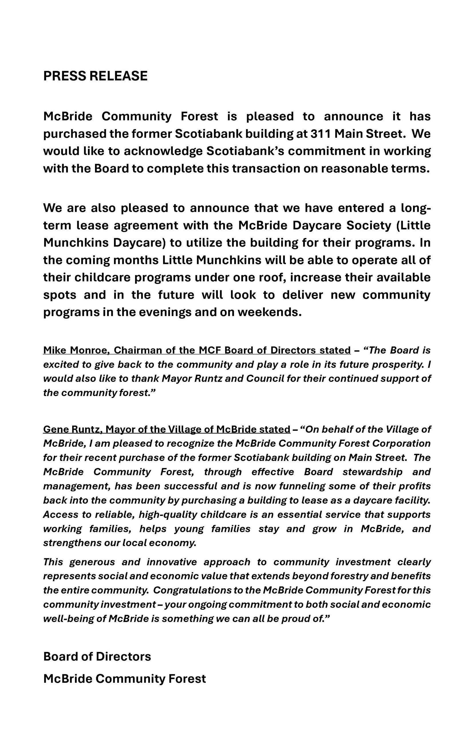 Gene Runtz, Mayor of the Village of McBride stated – “On behalf of the Village of McBride, I am pleased to recognize the McBride Community Forest Corporation for their recent purchase of the former Scotiabank building on Main Street. The McBride Community Forest, through effective Board stewardship and management, has been successful and is now funneling some of their profits back into the community by purchasing a building to lease as a daycare facility. Access to reliable, high-quality childcare is an essential service that supports working families, helps young families stay and grow in McBride, and strengthens our local economy.